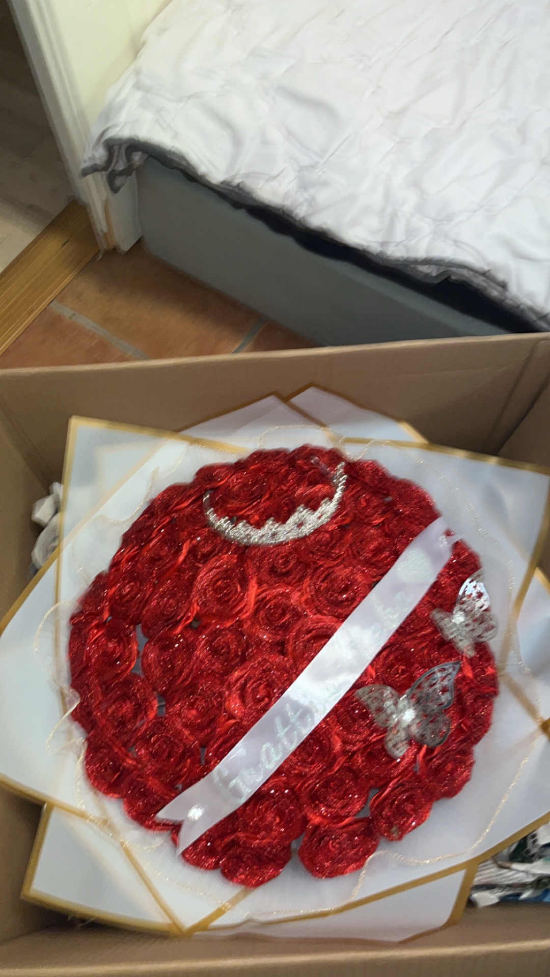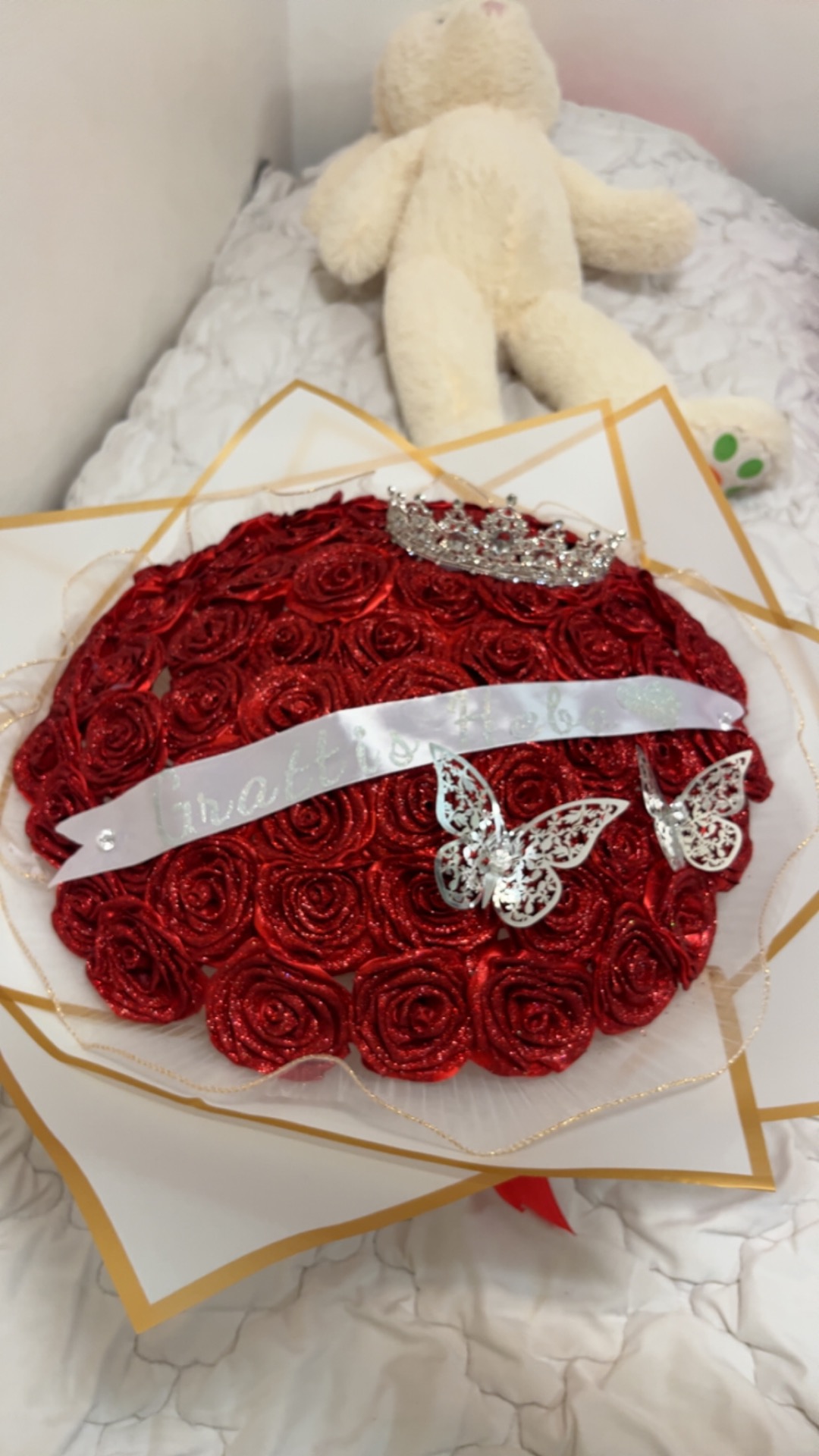 förlovningsbukett innehåller 60rosor med personlig text + fjäril + krona